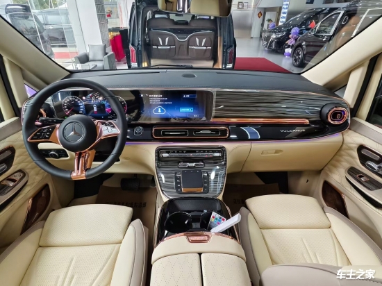 26款奔驰V300L长轴距豪华版作为福建奔驰的旗舰MPV,它延续了家族化设计语言,车身尺寸达到5370×1928×1920mm,轴距3430mm,采用2+2+3七座布局,外观设计:商务范拉满的移动行宫前脸采用横幅镀铬格栅搭配立标,几何多光束LED大灯组支持智能光区调节,夜间行车安全性大幅提升。车身侧面线条平直,双侧电动滑门+隐藏式滑轨设计,搭配19英寸迈巴赫风格轮毂,商务气息浓郁。车尾部分较为简洁,纵置LED尾灯与前脸呼应,尾窗支持独立开启,取放小件物品更方便。