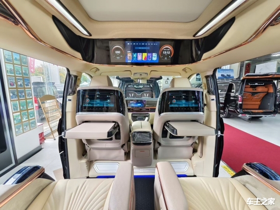 新款高顶V300升级CarPlay/CarLife互联,但语音交互功能较弱,仅支持基础指令。第二排配备航空座椅,支持加热/通风/按摩/腿托/一键躺平,中央扶手集成手机无线充电和冷暖杯托,细节设计贴心。第三排座椅支持电动放倒,但腿部空间相比竞品略窄,且未配备独立储物格和杯架。