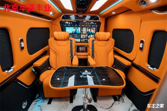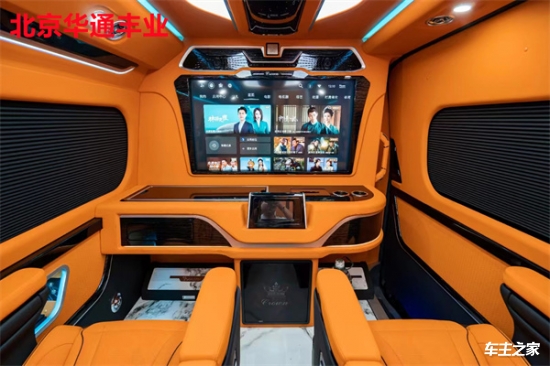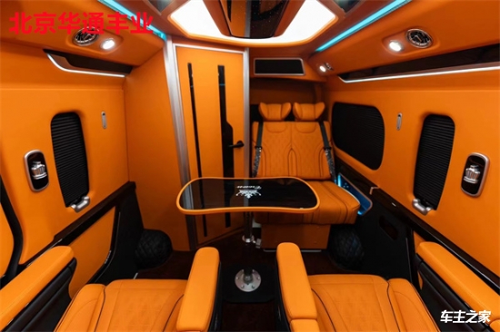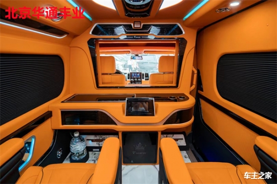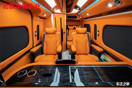 在舒适性方面,第二排配备了两张可360度旋转的航空级座椅,支持电动调节、加热、通风及按摩功能,搭配可伸缩的折叠桌板,方便乘客办公或用餐。第三排则采用联排沙发设计,可一键放平成临时休息床,座椅面料选用透气性极佳的意大利进口真皮,缝线工艺考究。车顶内嵌环绕式氛围灯带,支持多色调节,配合隐私窗帘和双层隔音玻璃,营造出静谧私密的乘坐环境。